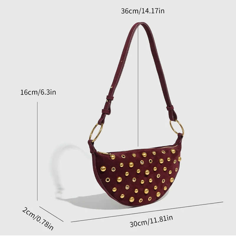 Meet Sandro, a suede sling bag with metal studs and zip closure. She has adjustable shoulder strap and can be worn as a crossbody. C'est chic!